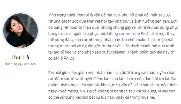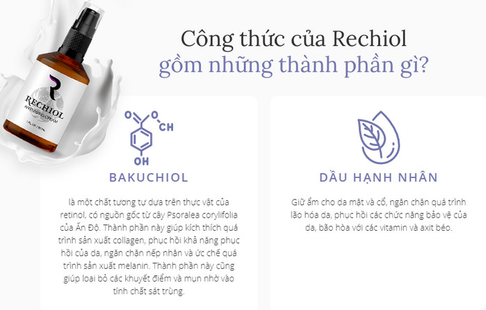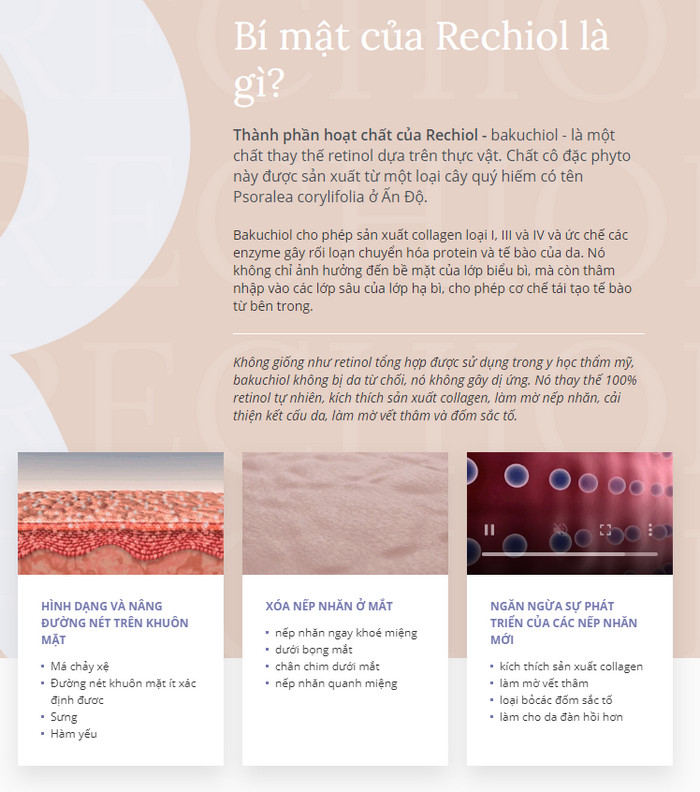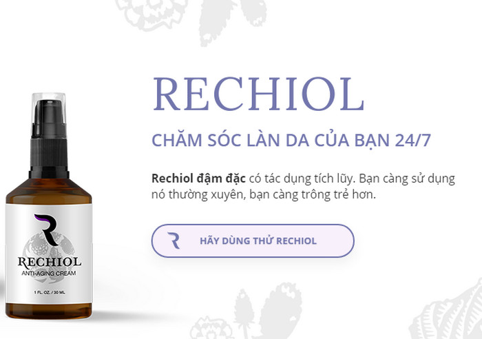 Rechiol giúp giải quyết vấn đề nếp nhăn, nám trên mặt, màu da xỉn màu và tông màu kém. Mỹ phẩm cho da có thể làm việc kỳ diệu, hay đúng hơn, trả lại cho làn da một vẻ ngoài đẹp, săn chắc và phù hợp. Thành phần tự nhiên quyến rũ 97% – và tôi muốn nhanh chóng thử loại serum này. Nếu trong 12 tuần, làn da của bạn không cảm thấy sự khác biệt, công ty sản xuất sẽ trả lại tiền.